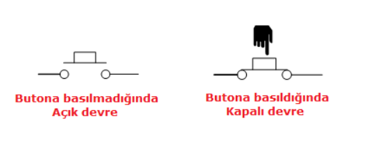 Buton, iterek üzerine basıldığında elektrik akımının geçmesine izin veren elemandır. Normalde butondan akım geçmez. Butona basarak üzerinden akım geçmesi sağlanır.