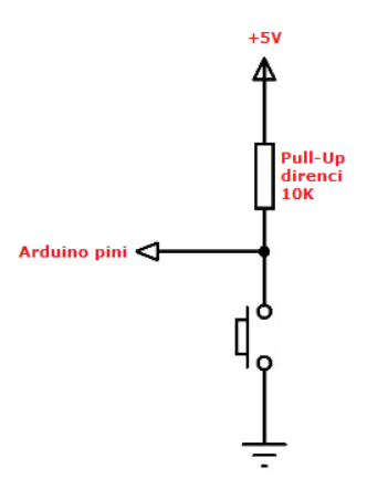 İkinci yöntemde ise butona basılmadığı sürece Arduino pininin sürekli Lojik1(HIGH) konumunda tutulması sağlanır. Bu yöntemde kullanılan 10K’ lık direnç Pull-Up direnci olarak isimlendirilir. Butona basılınca Arduino pinine Lojik0(LOW) gönderilir.