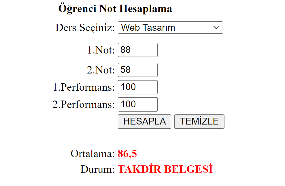 <pre class="lang: decode:true "> protected void BtnCalculate_Click(object sender, EventArgs e) { double not1, not2, per1, per2, avg; not1 = Convert.ToDouble(TxtNot1.Text); not2 = Convert.ToDouble(TxtNot2.Text); per1 = Convert.ToDouble(TxtPer1.Text); per2 = Convert.ToDouble(TxtPer2.Text); av = (grade1 + grade2 + per1 + per2) / 4; LblOrt.Text = Convert.ToString(avg); if (avg < 50) { LblStatus.Text = "FAILED"; } else if(avg>=50 && avg<70) { LblStatus.Text = …